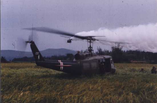 UH-1H 037 - Dropping troops in a rice paddy while Smokey lays smoke around the LZ. 037 was a good aircraft. Picture contributed by Steve Kerchenfaut.