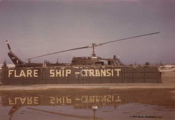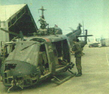 UH-1H 67-17510 docked at the flare revetment for flare duty. The following was recieved via E-mail from Charles Chatham on 05/18/2000: I remember one time it was hooked home because of a oil line coming off in the Hell Hole and we were forced to land outside some village until Blacksmith came and when the problem could not be determined in the field the decision was made to call in a CH-47 to hook it back to the manor where the problem was found. Another incident was when we were making a troop insertion near LZ center. It was a combined mission with several other companies. My ship was shot up a bit after the second insertion, we landed at the loading LZ and had to manually shut the fuel off as the umbilical cord for the circuit breakers had been shot up and the pilot could not shut down the engine. Kerlin was my gunner at the time, the pilot and peter pilot did get some shrapnel damage but were OK. The helicopter was again hooked out from there back to the Minuteman Manor. It was in repair for a couple of weeks for electrical and mechanical damage. Another time it was damaged during the night when a mortar landed between the unprotected side of the revampment out on the flight line. We also lost the door on the gunners side once. And on another day we received 3 bullet holes on the CE side leading from below my foot towards the back of the fuel cell. We flew away from the pacified village we were resupplying and checked for leaks later at another site. I had taken pictures of some of the damage done during the troop insertion damage at LZ Center but my pictures were lost. Picture and information contributed by Charles Chatham.