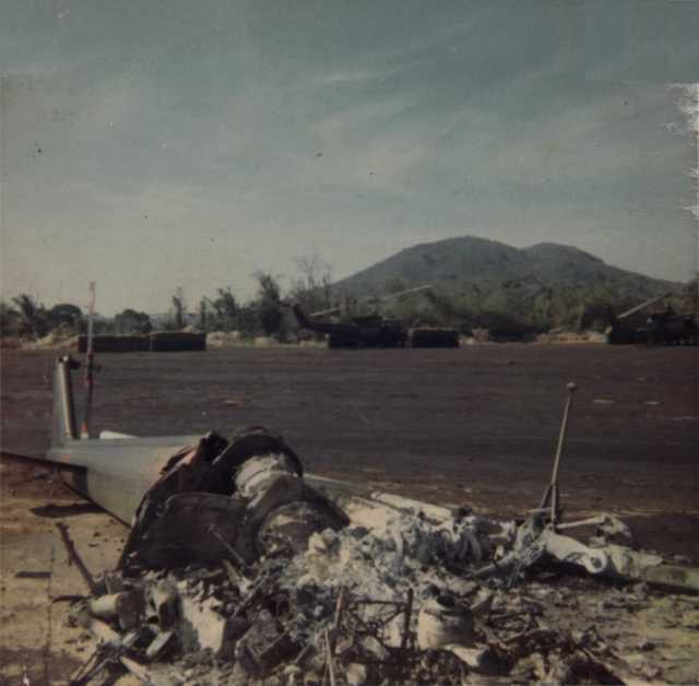 An unidentified chopper burns on the airfield at Duc Pho. Picture contributed by Hank Anthony.