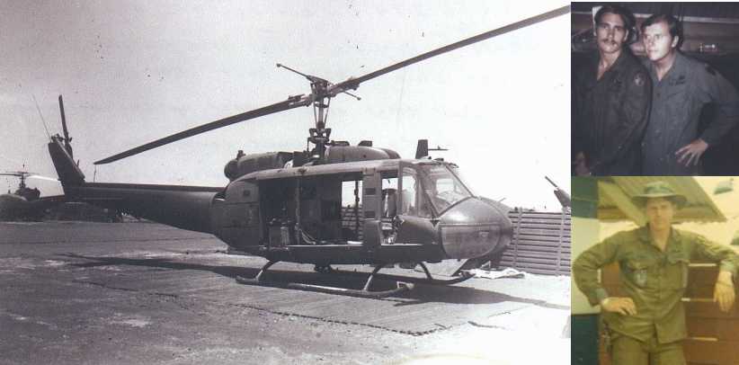 UH-1H 67-17239 in a revetment at the Manor. Note the plexiglass patch in the right chin bubble. Rick recalls that the bullet ripped up the instrument panel pretty good, but he can't remember who was peter pilot that day. Bet that peter pilot remembers the day well. In this picture, all the panels have been pulled in preparation for P.E. or battle damage repair. The ammo can in the gunner's well was a 40mm ammo can which would hold 2800 rounds of 7.62mm for the M60. The small pictures on the right are the crew and friends who flew many hours together on 239. L to R- Door gunner Walter Hall (KIA), crew chief Rick Reavill, and aircraft commander Jerry Penny. Picture and information contributed by Rick Reavill.