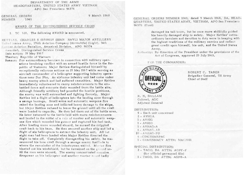 Story #2 is about Jerry Penny. Jerry served in the 176th AHC during 1970 and was killed in an auto accident on April 27, 1981. Story #3 is about the Bob Hope U.S.O. Christmas show, Da Nang, South Viet Nam Dec. 24, 1970. Clayton Jeter Story #4 The One and Only Time I Forgot my Chicken Plate, April 7, 1970. Contributed by John Longstreet, MM X-Ray. Story #5 Incident Report involving UH-1H 17458 flown by Philip Richard with Rick Phillips' memories of the incident and other information about Philip Richard. Story #6 The aftermath of Typhoon Hester which blew through Chu Lai in October 1971. Contributed by Craig 'Thor' Thoricht. Story #7 Article From Southern Cross Vol 2, No.9 Chu Lai, Vietnam April 27, 1969- 21 Impact Awards for 176th Chopper Rescue. Contributed by Jerry Herman. Story #8 An F-4 Phantom Shoots Up The Manor. Contributed by Ralph Liening. Story #9 A War Story "TINS" about Mike 'Pick' Pickles contributed by John Longstreet. Story #10 Have You Released Our Bird? Story contributed by Hank Anthony. Story #11 This story is about a series of "Prairie Fire" missions that took place in August 1970. Story contributed by Rick Reavill and Steve Clark. Story #12 The Stories Behind The Disconnected Pitch Tube. These two stories were contributed independently by Ed Covill and Tom Herrington. Story #13 They Don't Monkey Around -An article from "The Army Reporter", Sept. 30, 1967. Contributed by Les Hines, ADVA Historian. Story #14 Aviator Flies Beaucoup Hours. Article about CW2 Albert C. Cerullo from "The Falcon", December 22, 1968. Article contributed by Les Hines, ADVA Historian. Story #15 New LZ:"Minuteman" Article about the naming of an LZ by the 5/46 Infantry for the 176th AHC "Minutemen." from "The Falcon", March 18, 1969. Article contributed by Les Hines, ADVA Historian. Story #16 Change Of Command At The 176th from "The Falcon", February 2, 1969. Article contributed by Les Hines, ADVA Historian. Story #17 A Day In The Life Of A Check Pilot. Contributed by Don West. Don was a 176th IP (and a good one) during 1970-71. Story #18 A story about some major monkey business in a dark latrine. Story contributed by Ken Garrett. Story #19 A story about on of the Kingsmen who visited the Manor and his memories of the beach. Story contributed by Dennis Kreish Story #20 A collection of stories about life in the 176th AHC in 1968-69. A C-130 crash at Chu Lai West in December 1968 and other information contributed by Mike Parris. Story #21 Wreckage Of Dreams contributed by Brian Lambie. Story #22 Another Day in the Life of a Musket. A story about a one of those Special Forces missions that "didn't happen" when there were "no U.S. ground forces in Laos." Story #23 15 May 1967 - Reds Down 6 Copters - a Stars & Stripes news article, a recollection from Roland Scheck, and orders for the Award of the Distinguished Flying Cross. All are descriptions of action that ended Roland Scheck's Vietnam tour with the 176th AHC because of wounds resulting in the amputation of his leg. Information contributed by Roland Scheck. Story #24 Memorable Combat Experience - A story about 15 May 1967 contributed by Donald E.Long. Anyone reading this story who ever flew in this area in later years should immediately recognize the description of how to get to the river valley called "Chump Valley" in this story. It was never a "Happy Valley" unless you were happy to get the hell out of it. The door gunner mentioned in this story as being severly wounded is Roland Sheck. Several individuals mentioned in this story received awards for bravery. The documentation is ongoing, but so far it is known that Major Charles Kettles (view image of award) and Chief Warrant Officer Raymond R. Secrest received the Distinguished Service Cross and Captain Don Long and Warrant Officer Ron Roy received the Silver Star. It is believed that PFC Washington and SP4 Hawley were awarded the Distinguished Flying Cross. Also, it has been reported that Bob Bodo, not mentioned in the story also received a Silver Star in this action. Story #25 Phoenix (Rising From My Ashes)- A very personal story about the effects combat during the 15 May 1967 extraction in "Chump Valley" written by Dave Roblyer. Dave Roblyer was awarded the Purple Heart and the Silver Star for his part in this action. That day, Dave Robyler was AC, William C. "Chuck" Wilcher was pilot, Francis O'Marion Mack (died after tour) was crew chief, a person called "Bones" was gunner. The ship was UH-1D 65-10061. Story #26 A 1967 news article from The Screaming Eagle September 6, 1967 contributed by Hank Anthony. Story #27 Red Gunners Bag 5 Helos in 1 Day- Pacific Stars & Stripes Wednesday, April 22, 1970 furnished by Les Hines, ADVA Vietnam Historian. Story #28 U.S. Loses 27 Helos In Week- Pacific Stars & Stripes article from Sunday, April 26, 1970 furnished by Les Hines, ADVA Vietnam Historian. Story #29 Pacific Stars & Stripes Vol. 26, No. 134 Friday, May 15, 1970 Page 7 Story #30 Mr. Trunchon's CA, The Falcon, 16 CAG publication- Article provided by Les Hines, ADVA Vietnam historian. Story #31 A Night Of Terror, The Falcon, 16 CAG publication- Article provided by Les Hines, ADVA Vietnam historian. Special note: This is an article about the sucessful E&E of WO Frank L. Carson of the 71st AHC. The article omits the entirety of the event that night because although Carson successfully evaded, WO Frank Anton- Firebird 90, Robert Lewis- crew chief, and Jim Pfister- door gunner were all captured and held POW for 5 years. These men were a 71st AHC Firebird gunship crew. Story #32 176 AHC Birthday, The Falcon, 16 CAG publication- Article provided by Les Hines, ADVA Vietnam historian. Story #33 Who Needs A Sissy Harness? - A story about a few seconds in the life of a "charlie model gunship" crew chief during a combat assualt. Contributed by Larry Shatto. Story#34 Truth is Stranger Than Fiction - A story about a very costly maintenance mistake. Contributed by Craig Thoricht. Story #35 The Milk Run - A war 