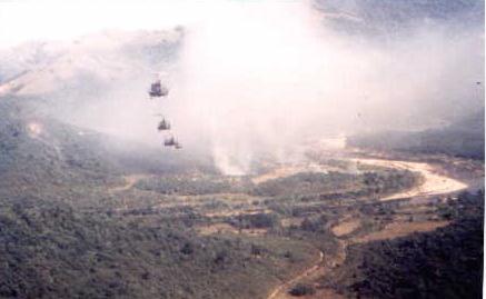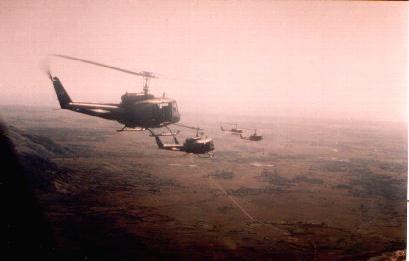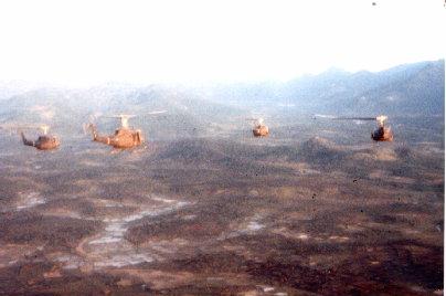 | 1) Taking off from Quang Ngai for one of those 30 ship Combat Assaults | 2)Either enroute or begining descending into an LZ during combat assault, as seen by trail (which direction are they headed?) |