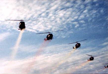 | 5)Sitting in an LZ during a combat assault. Although we were there only a few seconds, sometimes it seemed like hours. | 6)A fly by over Minuteman Manor trailing multi colored smoke. This was usually done after a successful Combat Assault. |